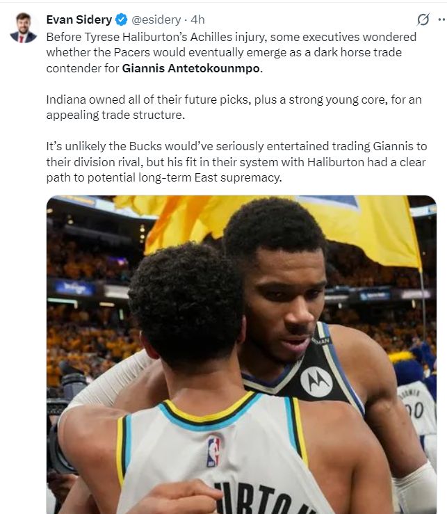 NBA记者埃文-斯迪瑞则透露,在哈利伯顿受伤之前,一些高管就猜测,步行者会最终成为扬尼斯交易的黑马,步行者也拥有大量选秀权同时拥有一支实力强劲的年轻阵容,这在交易中颇具吸引力。雄鹿不太可能将扬尼斯送出同区的活塞,字母哥+哈利伯顿的阵容可以让步行者成为东部长期霸主。