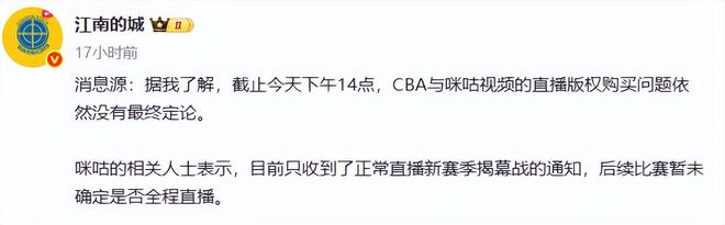 媒体人江南的城昨天报道:据我了解,截止今天下午14点,CBA与咪咕视频的直播版权购买问题依然没有最终定论。咪咕的相关人士表示,目前只收到了正常直播新赛季揭幕战的通知,后续比赛暂未确定是否全程直播。这就让球迷失望了,虽然央视每一天只直播一场,但是大部分场次我们看不了直播,只能有文字直播。也许最终CBA公司能与咪咕谈妥直播权问题,我们就等待吧。但是究竟哪天谈妥,真是心里没有底。