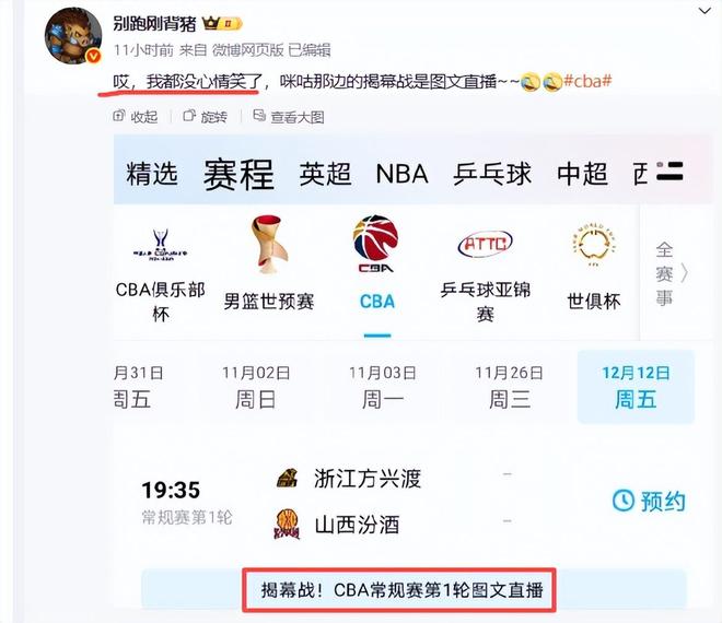 对于大部分比赛没有直播,媒体人也是进行吐槽。赵探长吐槽道:高中毕业就没看过图文直播了。别跑刚背猪说,cba的文字直播时代还真是挺久远的事情了,我记得cba最初的网络全场次直播好像还是13-15年之间的事情。他还直播表达:哎,我都没心情笑了,咪咕那边的揭幕战是图文直播。希望CBA公司尽快搞定直播权的问题吧,不然球迷急坏。你们说呢?